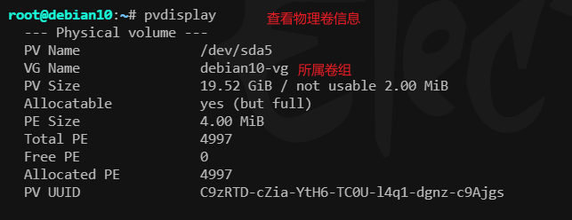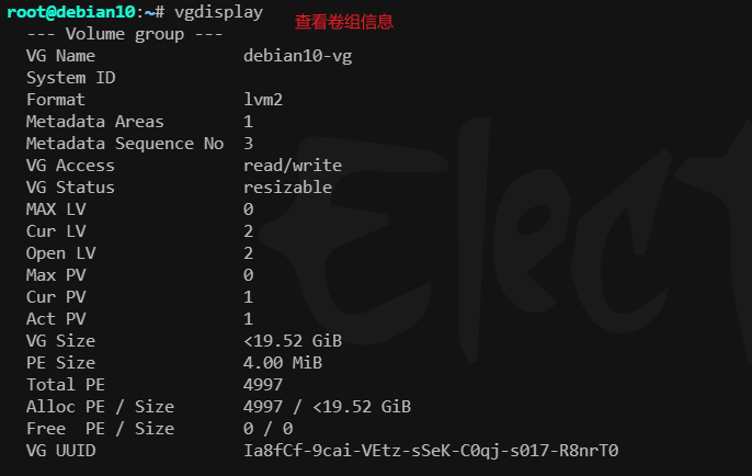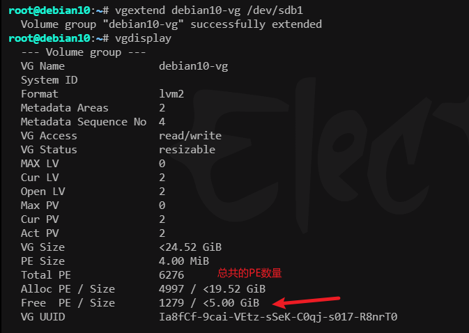 将添加新的物理卷,加载到debian10-vg卷组,使用vgextend debian10-vg /dev/sdb1命令。